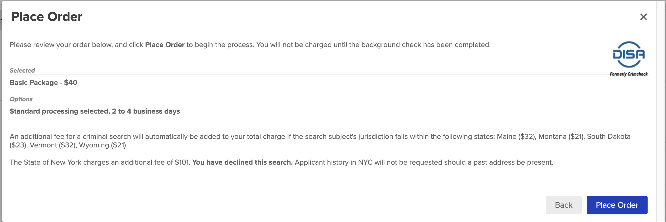 If you have any questions about the status of your background check, please don't hesitate to reach out to our Support Team. You can file a support ticket or contact us via chat. We're here to assist you by looking up your order directly or reaching out to the DISA team for further information if necessary.